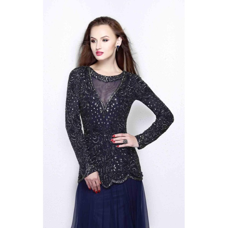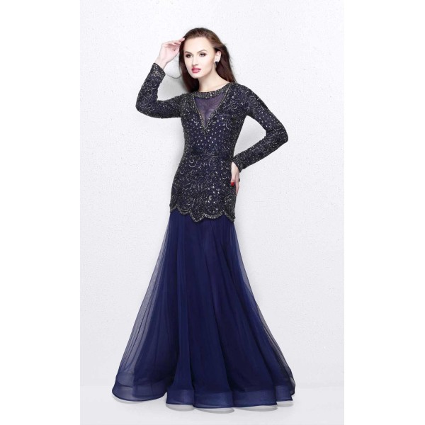 Get ready to sparkle in this Primavera Couture 1751 evening gown. This dress boasts long sleeves with a sheer panel at the upper portion. Fine shimmering beadwork winds throughout the dress creating serious texture and shine. The skirt has a flared A-line shape and finishes with a full length hem.