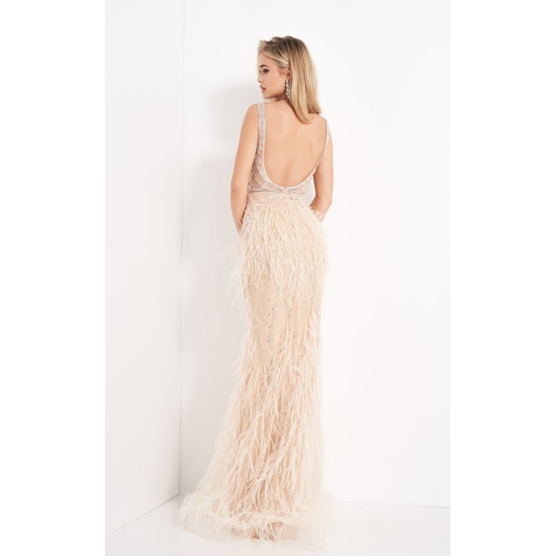 This stunning and vibrant dress by Jovani comes with sequins and beads enhancements on the bodice. The feather embellishments on the skirt feature the prom-wear trend of the season. The gown features a plunging V-shaped neckline to show off your curvy figure. Sway while you walk in this trumpet silhouette at full length and let heads turn.