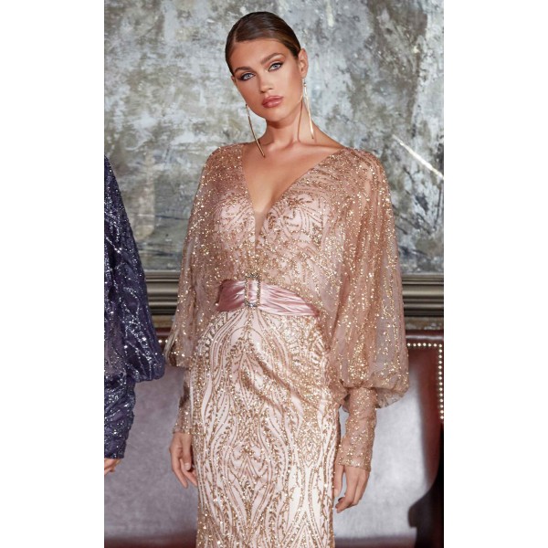 In your unique ways, you can style this extraordinary dress designed by Cinderella Divine. The gorgeous dress has a stunning V-neckline plunging to show off the cleavage. It also has huge bat sleeves that go quite well with the fitted mermaid silhouette. Beautiful dainty particles decorate the fabric of the dress in various patterns from the top to the bottom.