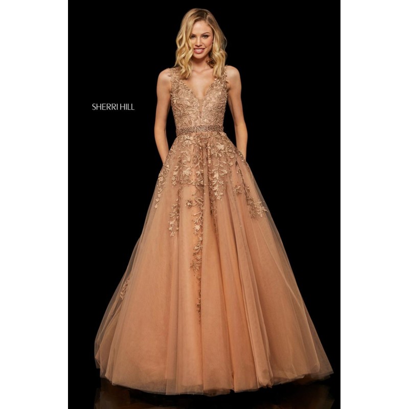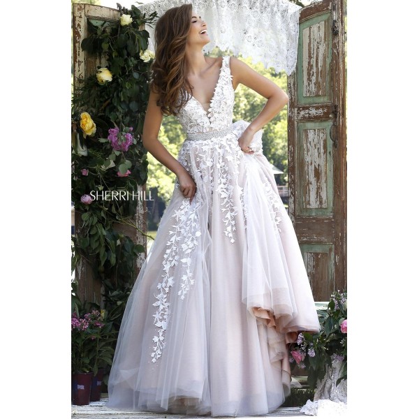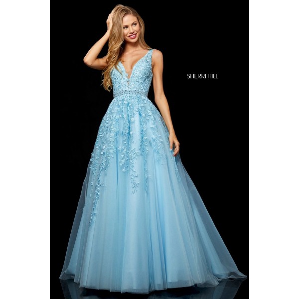 Waltz the night away in this beautiful ballgown from Sherri Hill. It has a sleeveless fitted bodice featuring floral appliques that trickle down to the skirt and a sheer inset V-neckline that plunges into the beaded waistline paired with a V-cut back. The A-line silhouette of the gown flares from the waist into a pleated skirt that flows to the floor a sweeping train.