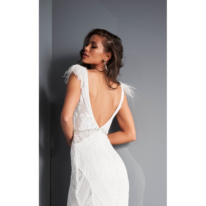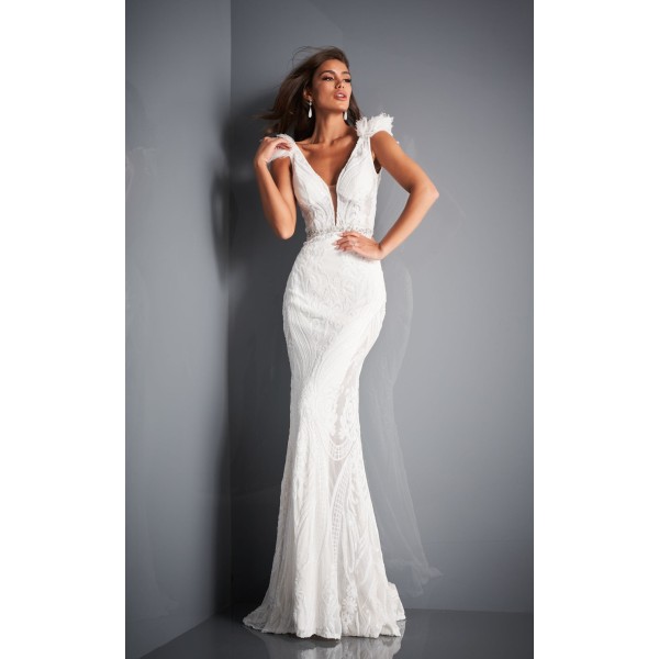 Look absolutely superb in Jovani 3180 Dress. This marvelous piece features a column silhouette and glittering accents. The short sleeve bodice has a v-neck neckline and a natural waist.