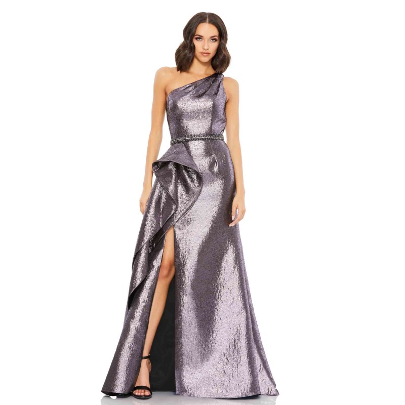 Express a magnificent persona wearing this long dress by Mac Duggal. It has an asymmetrical neckline and embellished waist belt. The trumpet silhouette is wrapped in a sheen finish and flaunts a high slit with a rosette panel at one side. The dress with a full-length hem ends with a sweep train.