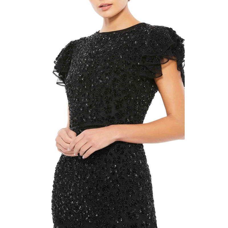 Ideal for red carpet occasions, this dress by Mac Duggal feels and looks graceful. Its jewel neckline, flutter sleeves, and a closed back look sophisticated, while the sheath silhouette is wrapped in glistening sequins. The dress with a full-length hemline ends with a sweep train and pairs well with stilettos.