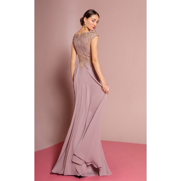 Walk the red carpet with this enticing dress designed by Elizabeth K. The dress features an embroidered design, highlighting the boat neck and waistline on the front and back. The bodice showcases a lace design with a covered back and cap sleeves. The A-line silhouette dress cascades into a long flared and paneled skirt that makes you look picture perfect.