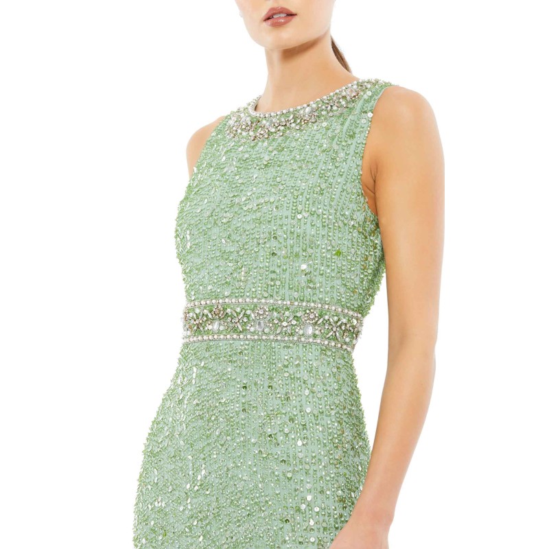 This gorgeous designer dress by Mac Duggal is a lovely dress with a jewel neck and cut sleeves. It has stonework all over the dress and colorful stones line the waist in the form of a belt and the neckline. This crafty dress is perfect for you to wear for occasions in the open so that the light can show off the crafty stonework.