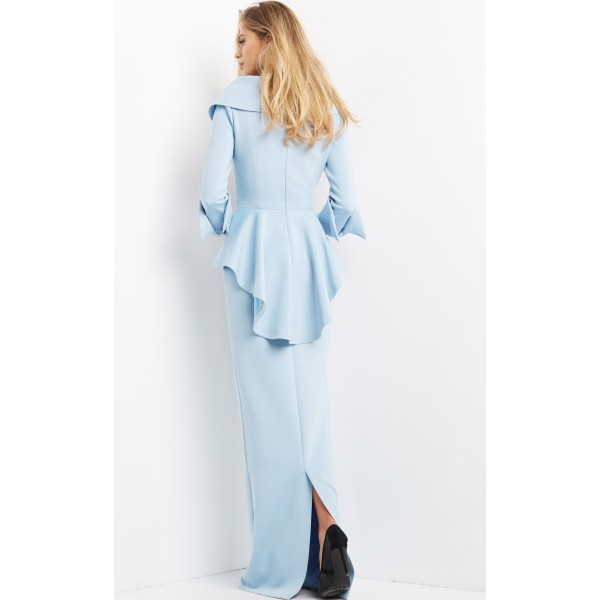 You will look enticing in this Collared Peplum Silhouette by Jovani. Adorned with a shawl neck and ¾ the sleeves that are rolled up slightly, this dress is a piece of art. The hem of the bodice extends like a ruffled tail on the back. The lower half of the dress has a straight fit with a high slit on the middle of the backside. The gorgeous dress can be worn with a pair of stilettos and accessorized with a clutch and you are good to go.