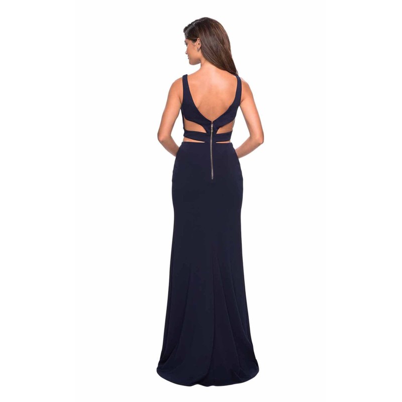 Sheath gown with sweetheart neckline and V-cut back by La Femme. Designed by La Femme this dynamic evening gown will accentuate your slender figure and steal the spotlight. Featuring cut-outs at the waist and back, the gown has a fitted bodice with sweetheart neck and a V-cut open back. A high side slit accentuates the floor-length skirt, baring your leg for a sexy edge.