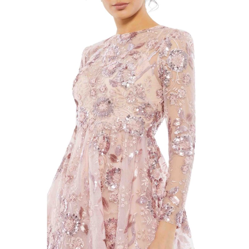 Create a ravishing look with this floral embellished dress from the house of Mac Duggal. This fully-lined outfit has an illusion neckline, full sleeves, and a closed back. It has an A-line silhouette and ends with a tea-length hem, accentuating your curves at the right places. Pair it with peep-toe stilettos.