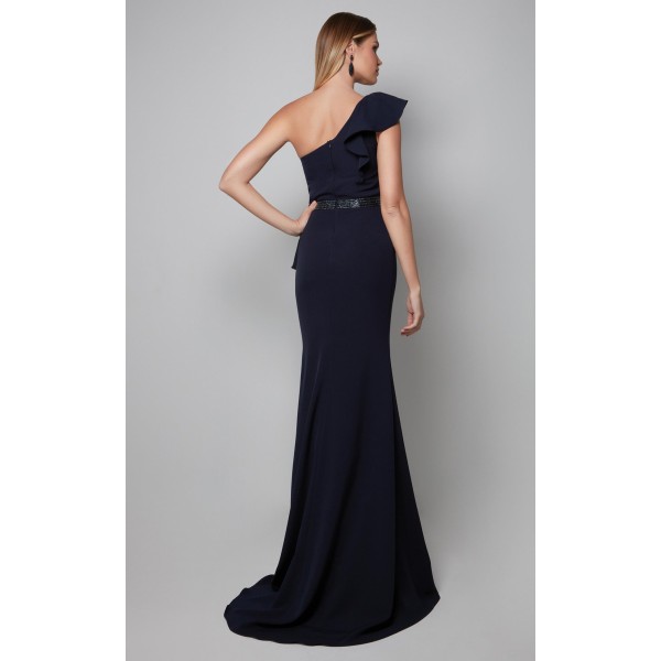 Asymmetrical Off Shoulder Beaded Waist Ruffle Accent Slit Dress by Alyce