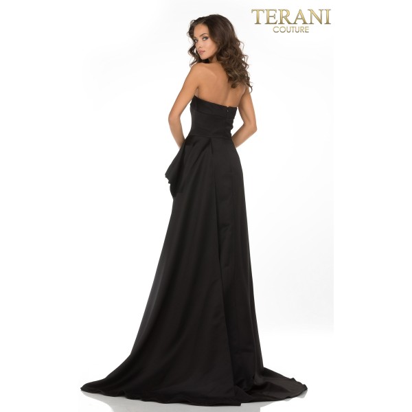 Make a bold statement in this remarkable dress by Terani. The ruffle details on the waist allow a thigh-high slit giving you freedom for your movements. The A-line silhouette flares to the floor dramatically in a full-length hem and a sweeping train in a delicate fabric. The strapless design in a straight across neckline adds definition to your shoulders, collarbones and your beautifully structured face.