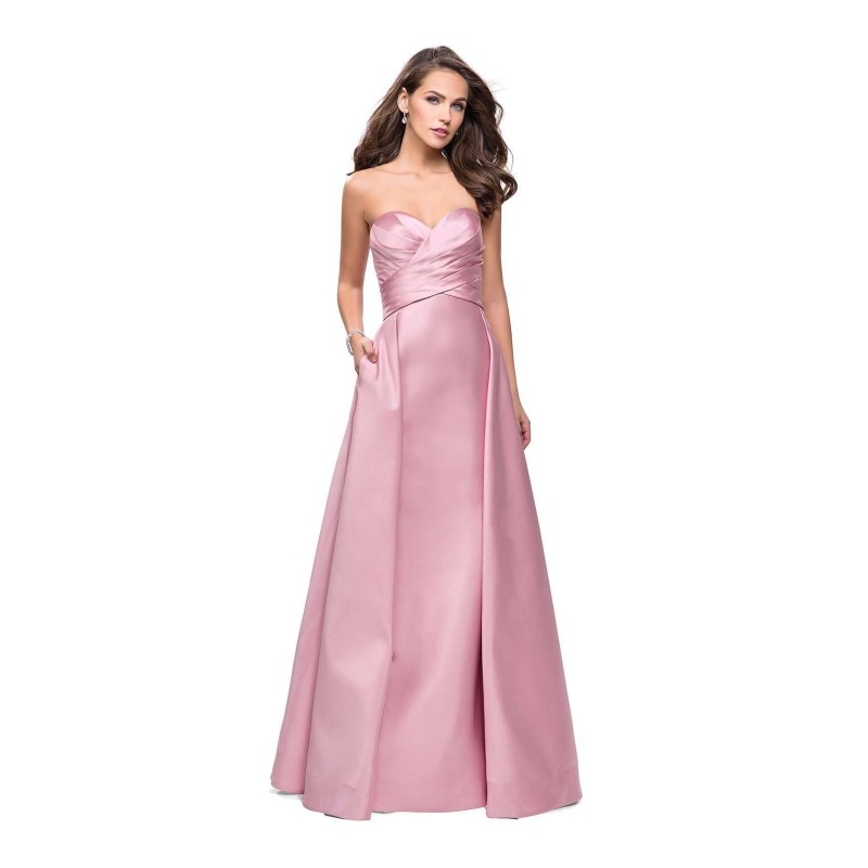 Embrace the wonder of your elegant event in this wow-factor evening gown by La Femme. The strapless, sweetheart bodice wraps the bust and midriff in lush tucks that trace a sculpted fit. The satiny skirt falls with understated flare to a smooth full-length while an open, folded overskirt streams from the trim waist to the feet.