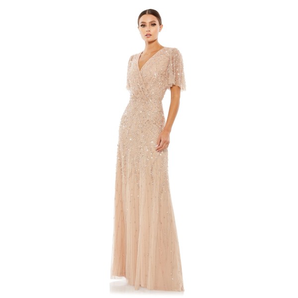 Dazzle bright in the crowd with this awesome creation designed by Mac Duggal. The gorgeous dress has an appealing A-line silhouette. The base of the dress is quite minimalist whereas the upper body has hefty decoration of embellishments. The mesh sleeves are loose with tiny sparkling elements. The V-neckline extends into a wrap bodice that sits comfortably on your curves.
