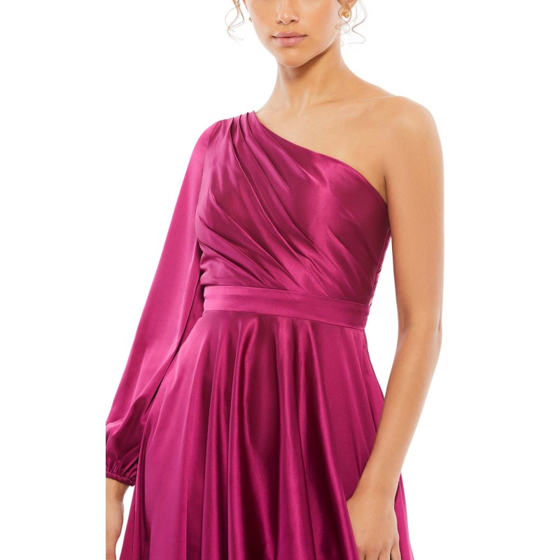 Fascinate the crowd by pulling off this chic outfit from the Mac Duggal collection. This wonderful fitted bodice is asymmetrically framed to give you a remarkable look. The one-side off shoulder design is balanced with the bishop sleeve on the other side. With a cinched waistline, the dress ends in an asymmetrical hem and flourishes down to the floor.
