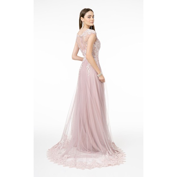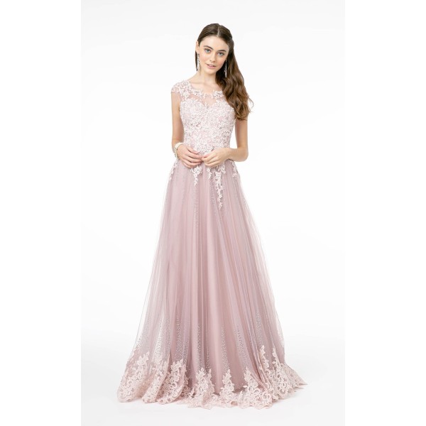 Look timeless in this class piece GLS by Gloria. The sheer bodice is accented in embroidery embellishments on the torso and back with illusion fabric. The beautiful dress showcases a scoop neck and a closed back with zipper. Designed in a detailed mesh fabric to enhance the detailed work along the dress, the dress is fitted along the bust and waist. The loosely pleated A-line mesh silhouette flares to the floor in a full-length hemline finishing off in a chapel train.