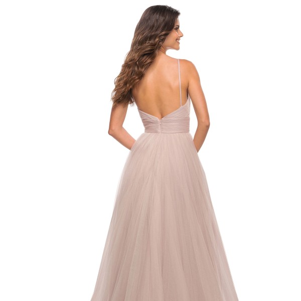 Look marvellous in this dramatic dress by La Femme. The sleeveless dress showcases a V-neckline, delicate spaghetti straps and an open back with back zipper. The torso features ruched details followed by loose pleats on the A-line silhouette. The wrap detailed waistband encircles the waist to give the appearance of a slimmer waist. The loosely pleated A-line tulle silhouette reveals your legs in an eye-catching slit that flares to the floor in a full-length hem.
