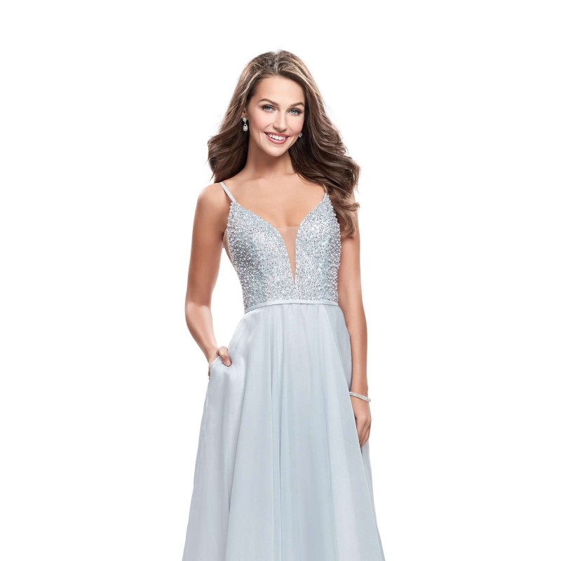Stir up some nighttime magic in this bewitching evening gown by La Femme. Satiny straps span the shoulders while the plunging V-neckline strikes a sultry note at center front. Translucent wedge-shaped insets accent the sides of the bodice, and shimmery embellishments highlight a curvy fit. The contrasting skirt has a self-fabric waist and hidden pockets at the hips. Lithe layers flare to an airy full-length.