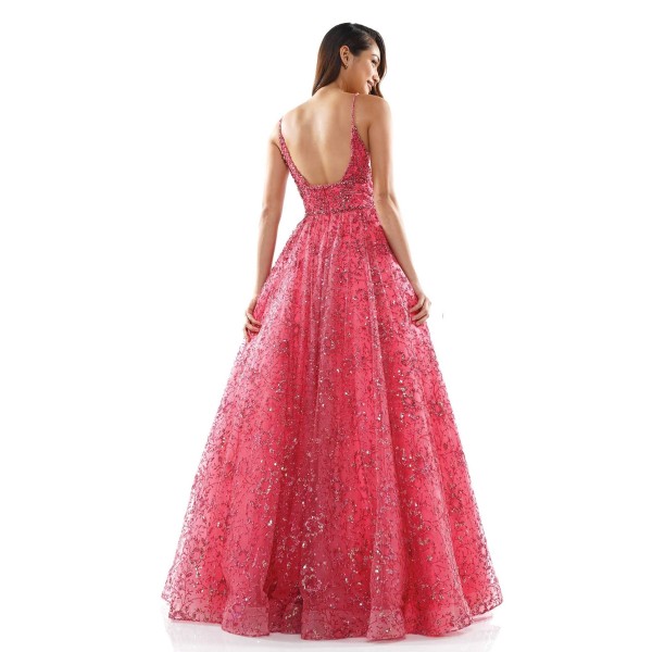 This glitter mesh A-line gown from Colors Dress is simply perfect for your next formal party! The fitted sleeveless bodice flaunts a plunged V-neckline with tonal sheer inset and an inset empire waistband. A deep scooped open back adds more appeal to your look. Adorned with sparkling bead embellishments throughout, this glittering ensemble has an A-line skirt that flares to the floor-length hem for a fascinating look.