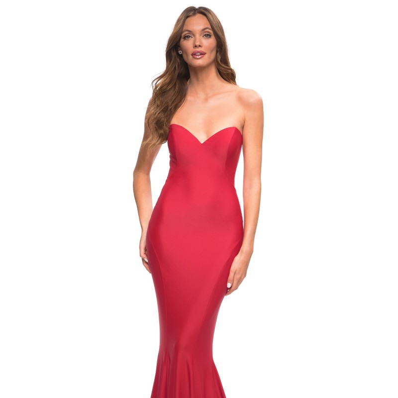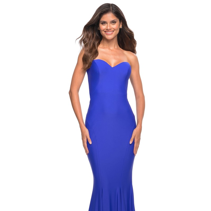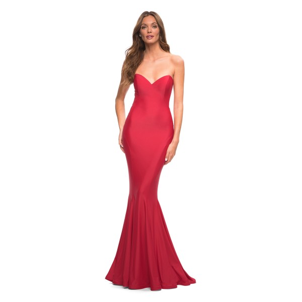 Rock your formal evening in this beautiful dress by La Femme. The fitted bodice is made in jersey fabric showcasing your bold collarbones and shoulders in a strapless design. Revealing a sweetheart neckline and a back with back zipper. The sleeveless bodice hugs your curves perfectly to make everyone go WOW! The skirt flares from the knee in loose pleats giving freedom to your movements. The fit and flare skirt glides perfectly to the floor in a full-length hem finishing off in a subtle sweep.