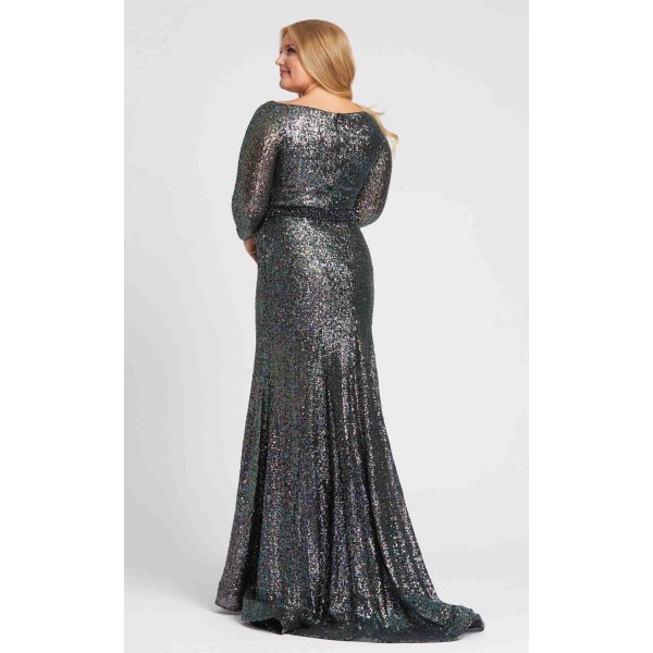 Glimmer and glitter in this enchanting evening dress from the Fabulouss collection by Mac Duggal. Exhibiting a plunging V-neckline, this outfit is embellished with a myriad of multicolored sequins all over it. At the ending of the neckline, the beaded work is enriched around the waistline. The mermaid bottom finishes off to the floor length in a subtle sweep train.