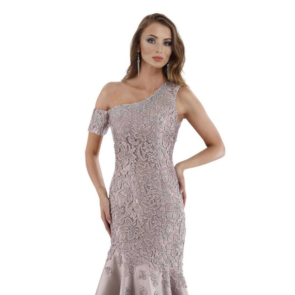 Engage in the excitement of your special event in this elegant evening gown by Ferani. The savvy, asymmetric neckline rises to one shoulder while a short sleeve details the opposite arm. Exquisite lace traces a feminine fit along the bust, waist and hips while tonal lining provides coverage and depth. A diagonal flounce accents the lower skirt, flowing in satiny flutters to a flared full-length.