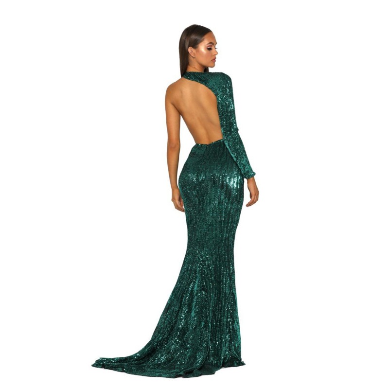 Let no one forget your prom look with this glitzy outfit designed by Portia and Scarlett. Featuring a fitted bodice, this gown has a single shoulder design that wraps around to form a long sleeve. The figure flattering silhouette of the gown flares down from the knees into a mesmerizing short sweep train.
