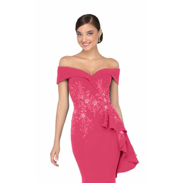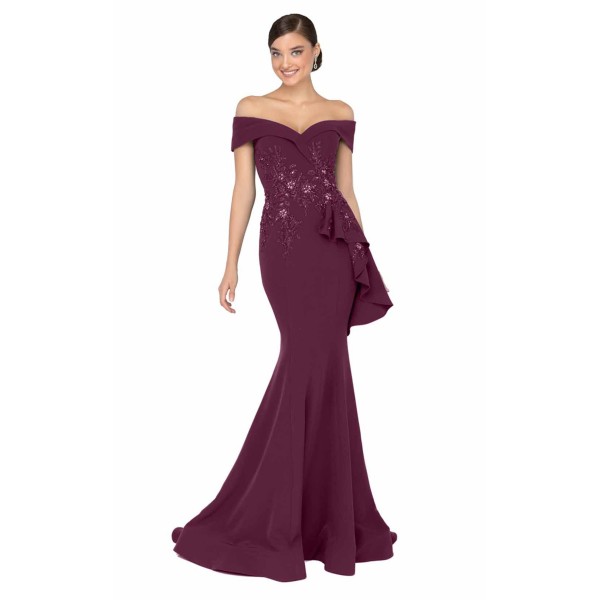Live up to your fashion style by wearing this chic mermaid gown designed by Terani Couture. Embellished with glittering beads and 3D flower motifs along the ruffled trim, this gown looks astounding. An off-the-shoulder neckline frames its fitted bodice. This gown flares from the knees into a pronounced mermaid silhouette before ending with a demure sweep train.