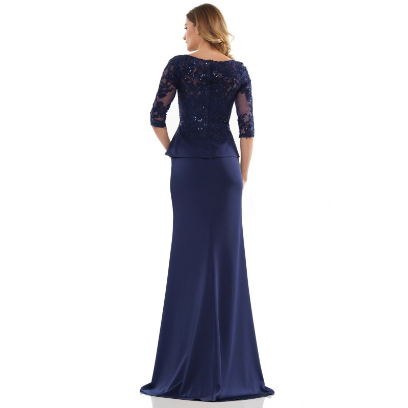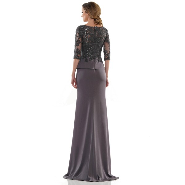 Look marvelous in this unique piece by Marsoni. The beautiful bodice is adorned in faille and lace fabric with pleats at the waist. Showcasing a crew neck and a closed back in a peplum top. Flaunt your legs in this subtle slit. The dress is fitted along the bust, waist and hips giving you a figure-flattering look. The fit and flare silhouette cascades below the waist and flares to the floor in a horsehair length hem finishing off in a subtle sweep.