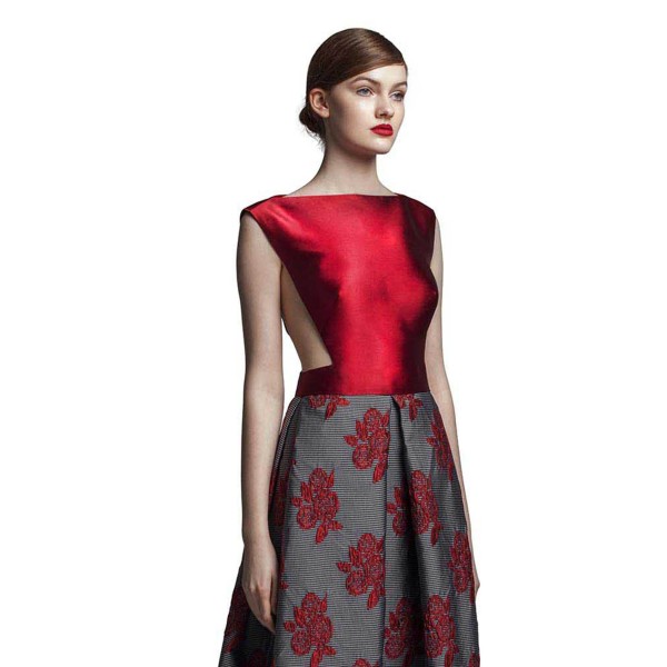 Fire up your evening in this sizzling sleeveless formal by Edition Gemy Maalouf. The apron-style bodice boasts a stylish bateau neckline and a curvy fit. Side cutouts from arms to midriff supply sensuous accents while a wide band encircles the waist. The contrasting skirt flares from inverted pleats to a fluttering hemline at full-length.