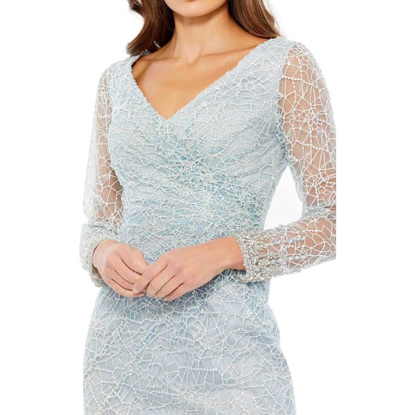 Spread the magic wherever you go in this elegant dress from the house of Mac Duggal. Its sheath silhouette is graced by sheer lace that gives the illusion of a spider web. The darling outfit has a V-neck with long sleeves and a closed back. Its knee-length skirt ends with a small slit at the back.