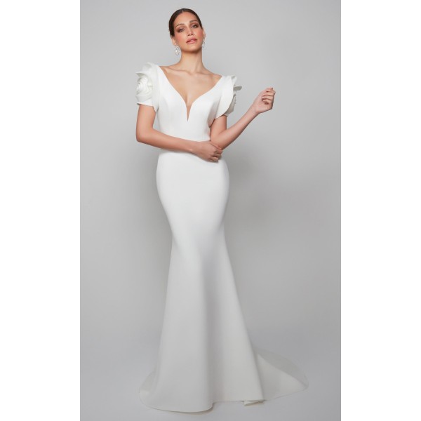 Looking for a dress that is elegant and feminine? This dress by Alyce is the perfect choice for you! It has a beautiful rose shaped sleeve, plunging neckline, and a fit and flare design. Featuring a V-shaped back and bodycon fitting, this dress will make you feel like a princess! The fit and flare skirt flares out from the knees, adding a flattering fit.