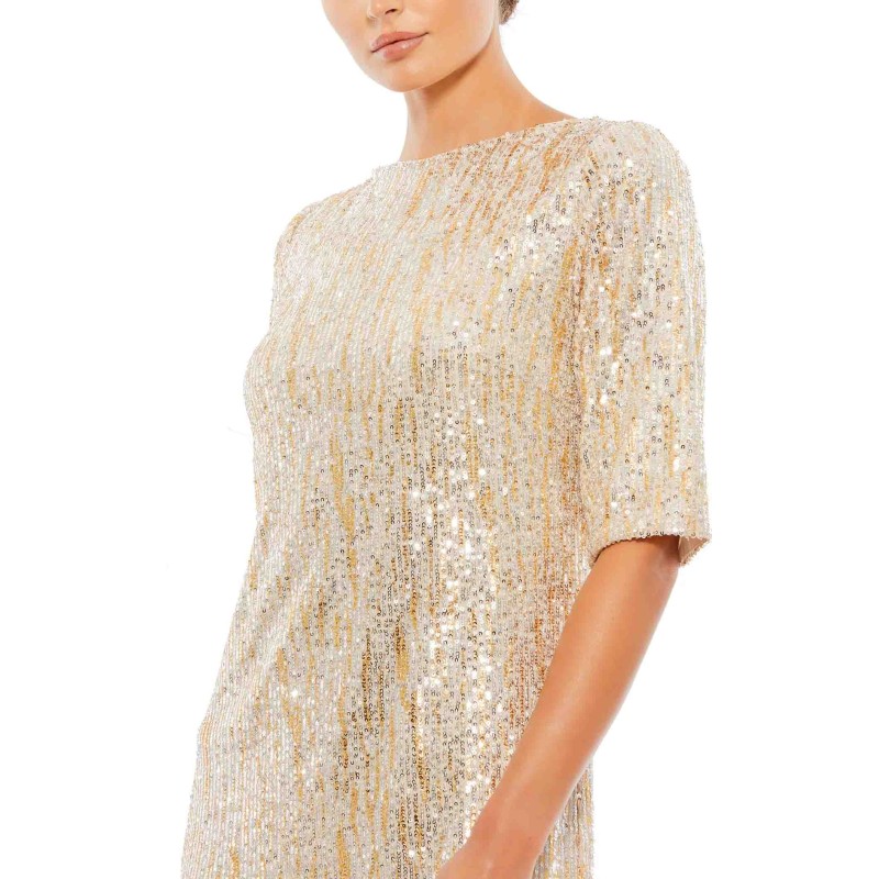 Look glamorous at your upcoming occasion by wearing this elegant attire from Mac Duggal. The dress features a jewel neckline with elbow-length sleeves to pull off chic vibes. Adorned with millions of beads, the dress furnishes a sparkly illusion. It has a mini length that ends with a unique asymmetrical cut.
