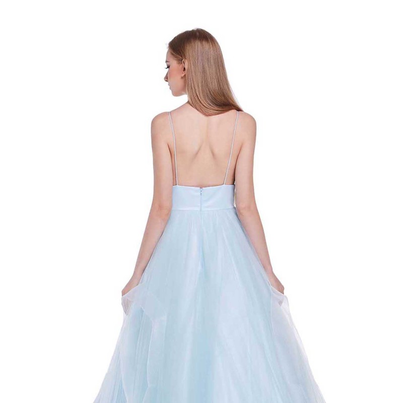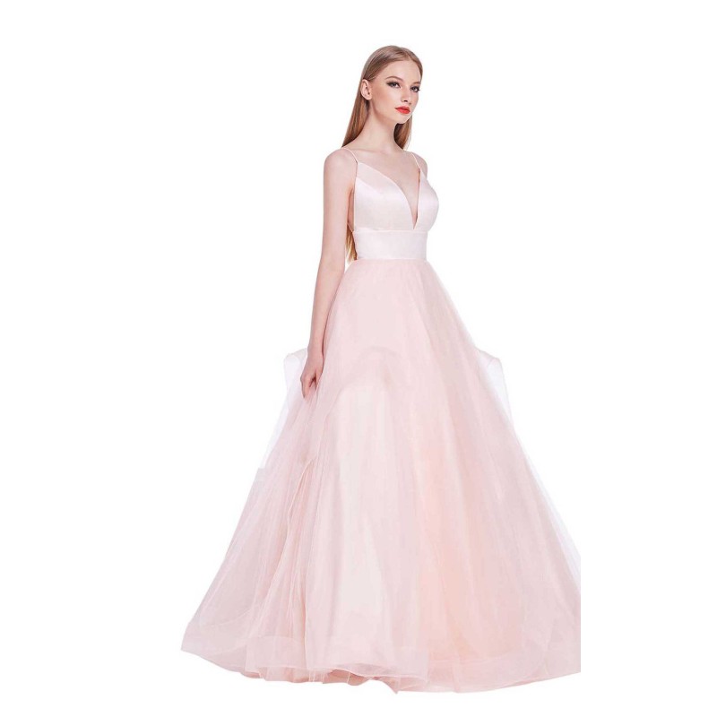 Walk with the stars in this stellar prom dress from the house of Jadore. The fitted bodice has a sleeveless design and a flattering plunged V-neckline. The slender spaghetti straps lead to a semi-open back. A wide waistband accentuates your curves. Featuring a full-length ballgown silhouette, the skirt displays an asymmetric tulle overlay that ends with horsehair hem for a spectacular appeal.