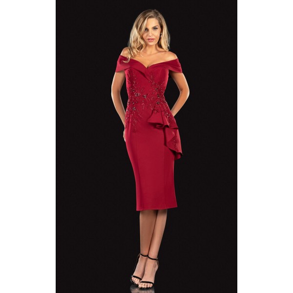 Refined to elegance, this stylish sheath dress in the Terani collection will make you the center of attention. The dress features a fold-over off-shoulder neckline on a fitted bodice complimented with matching 3D lace and beads on a stretch jersey. A peplum detail arises from the waistline and completes the look with a tea-length silhouette of the dress.