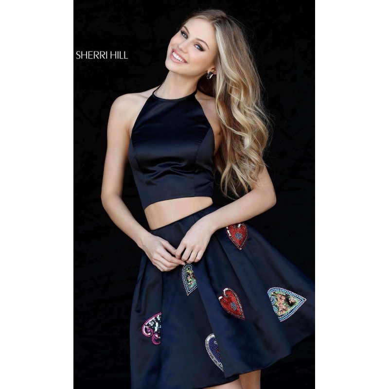 Let loose in a dress with attitude from Sherri Hill 51397. The halter style is augmented with a bateau neckline. Glossy fabric forms a lined crop top bodice. The babydoll skirt is flared with shirring and an artistic heart design made up of colorful beading for a unique effect.