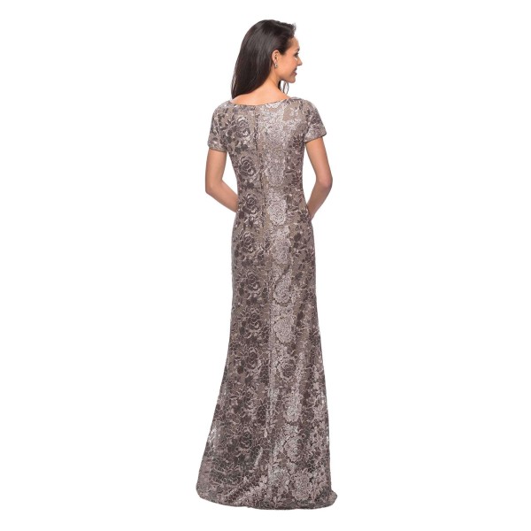 Floral pattern fit and flare gown with a high neckline and short sleeves by La Femme